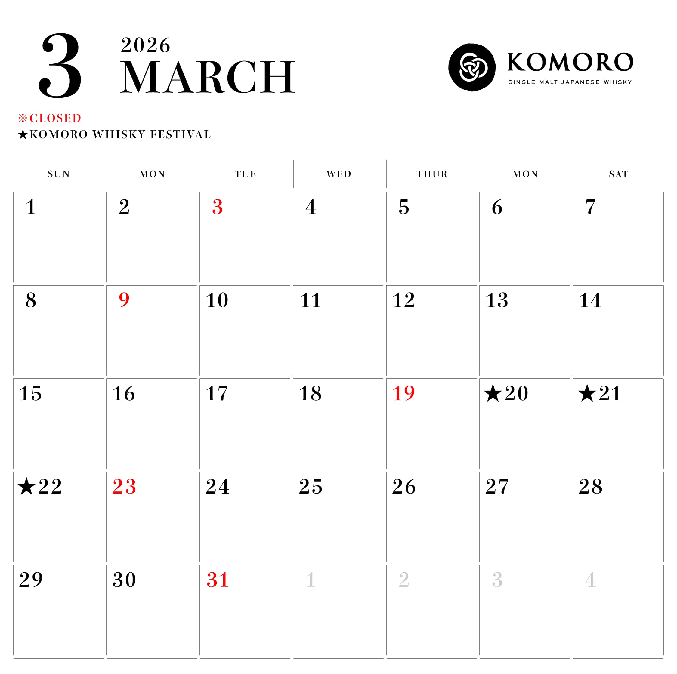 Notice of Closures for March 2026
